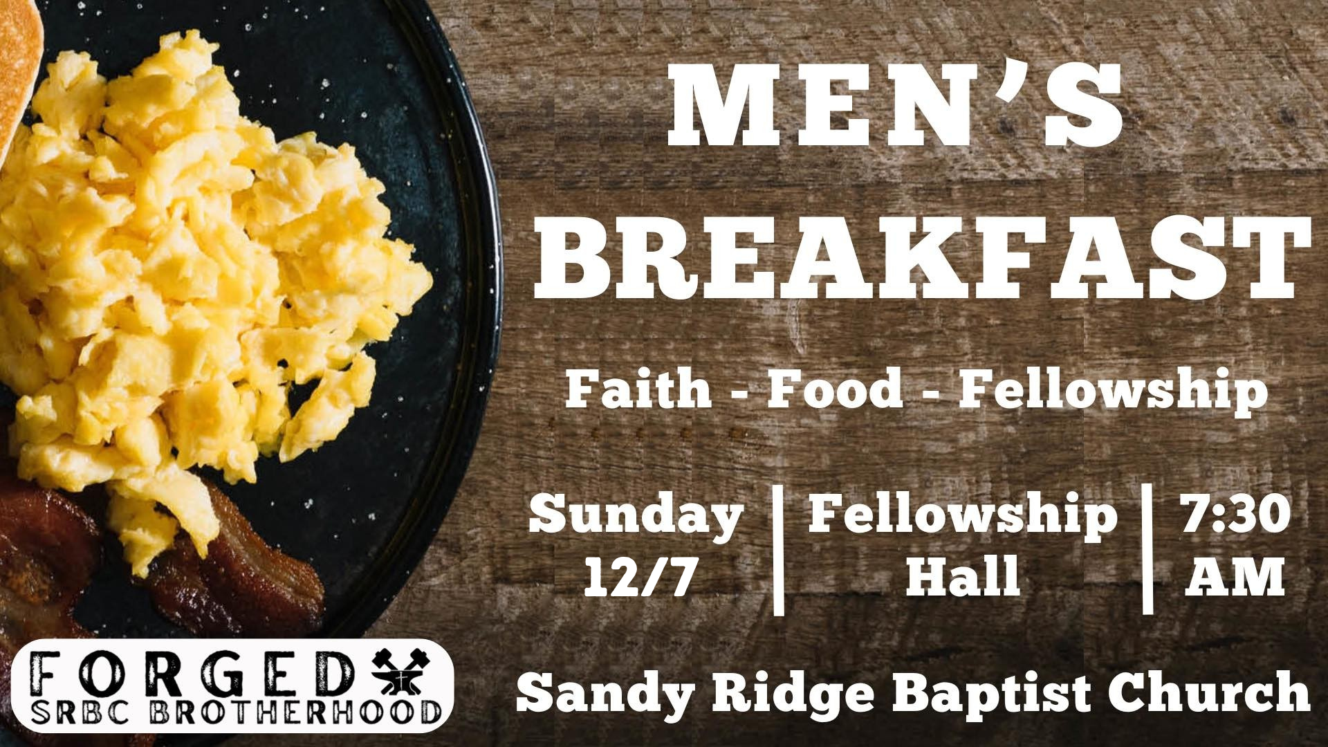 Our ministry meets on the second Sunday of each month at 6 PM for fellowship, prayer, and Bible-centered devotion. We also host a monthly men’s breakfast, providing another opportunity to grow in faith, build friendships, and encourage one another in our walk with Christ.